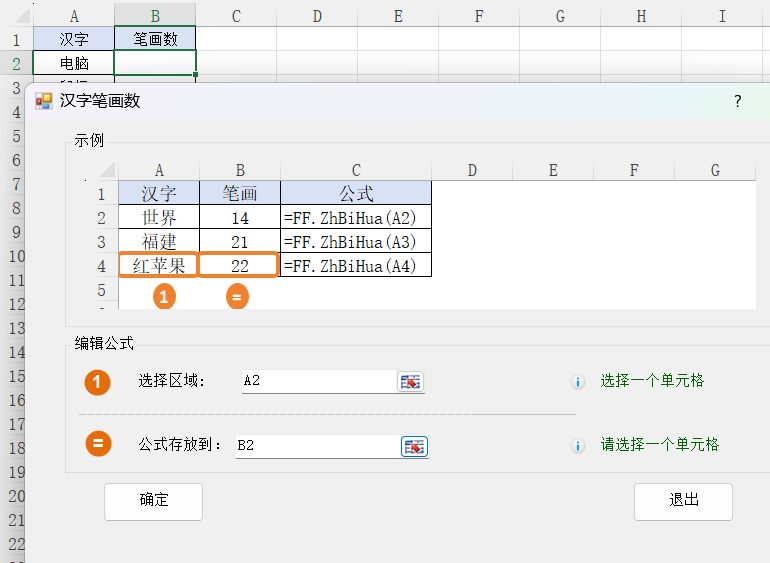 2.选择获取A2单元格的汉字笔画数,公式存放到B2,然后点击确定按钮