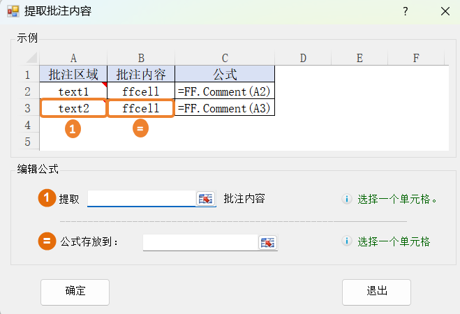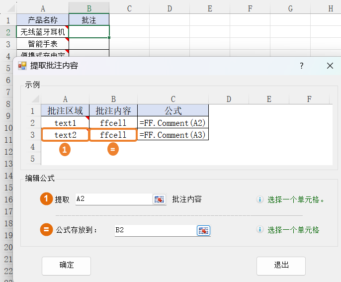 2.提取A2单元格的批注内容,公式存放到B2单元格,然后点击确定按钮