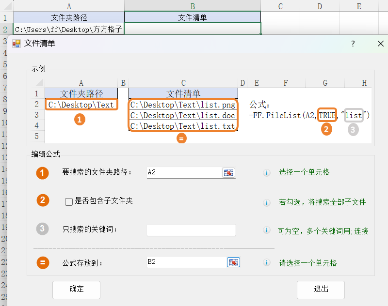 2.要搜索的文件夹路径选择A2单元格,公式存放到B2单元格,然后点击确定按钮