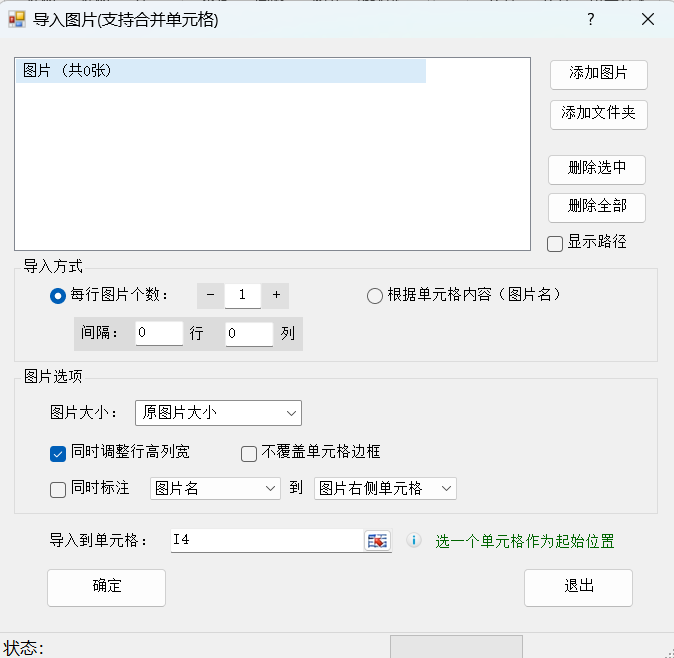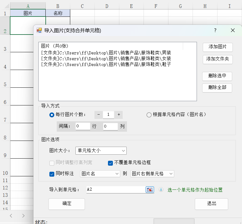 3.导入方式选择每行1个图片,图片大小选择单元格大小,同时标注图片名到图片右侧单元格,导入到起始A2单元格,然后点击确定按钮