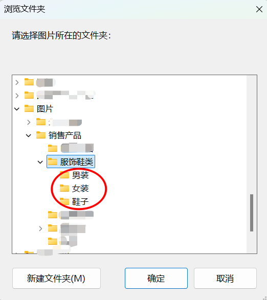 2.点击右侧添加文件夹按钮,选择需要导入的男装、女装、鞋子三个文件夹,点击确定按钮将文件夹添加到列表