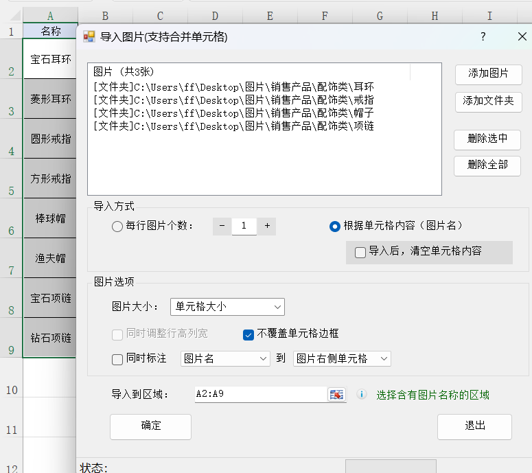 2.导入方式选择根据单元格内容(图片名)导入,图片大小选择单元格大小,导入到区域A2:A9,然后点击确定按钮