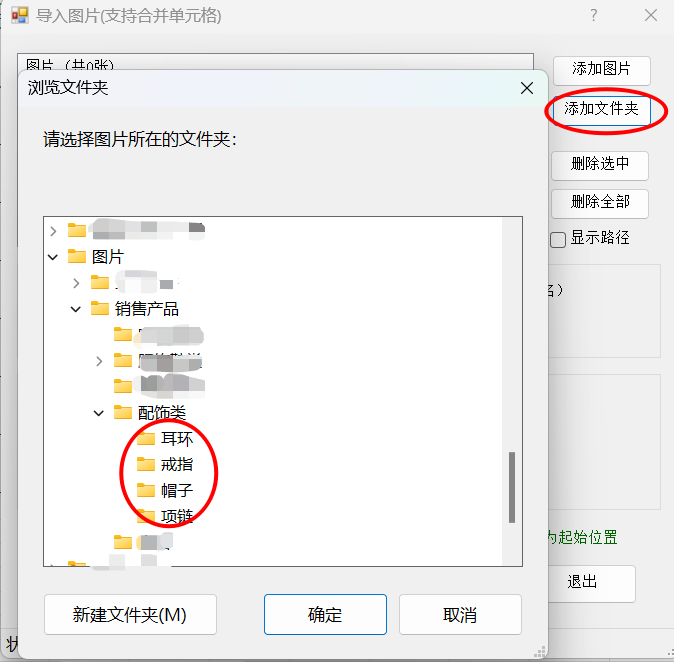 1.点击右侧添加文件夹按钮,选择需要导入的耳环、戒指、帽子、项链4个文件夹,点击确定按钮将文件夹添加到列表