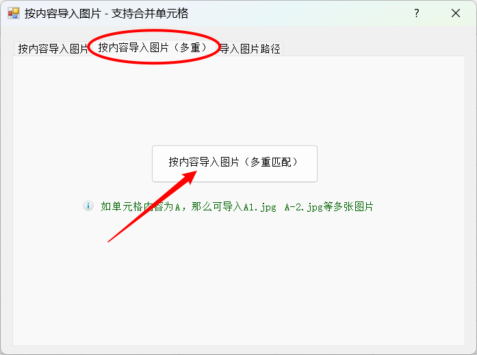 1.当多张图片都包含有相同内容时(如图片名孙悟空-大徒弟、猪八戒-二徒弟、沙僧-三徒弟...都含有内容 徒弟),需要根据相同内容导入这些图片,可以选择功能的第二个选项卡 按内容导入图片(多重),点击多重匹配按钮