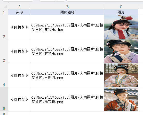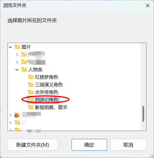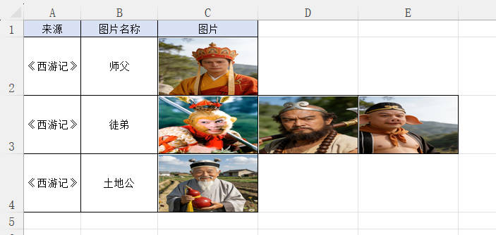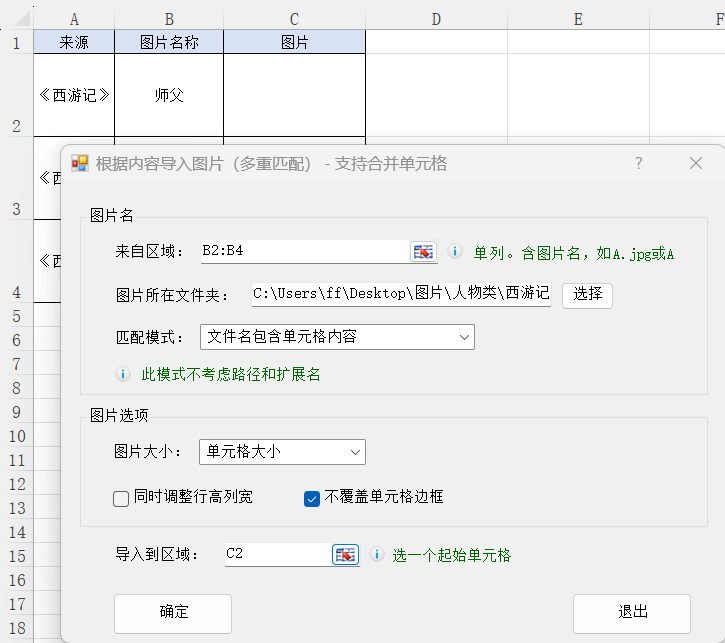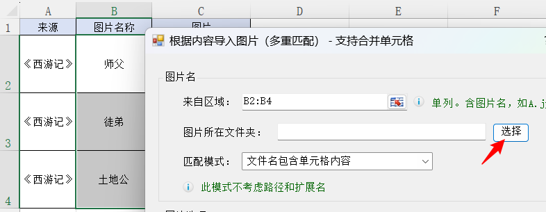 2.图片名选择来自区域B2:B4,点击右侧的选择按钮,选择图片所在的文件夹 图片>人物类>西游记角色