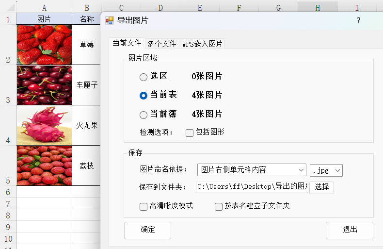 2.图片区域选择当前表,图片命名依据为图片右侧单元格内容,保存.jpg格式,保存到默认桌面文件夹 导出的图片,然后点击确定按钮