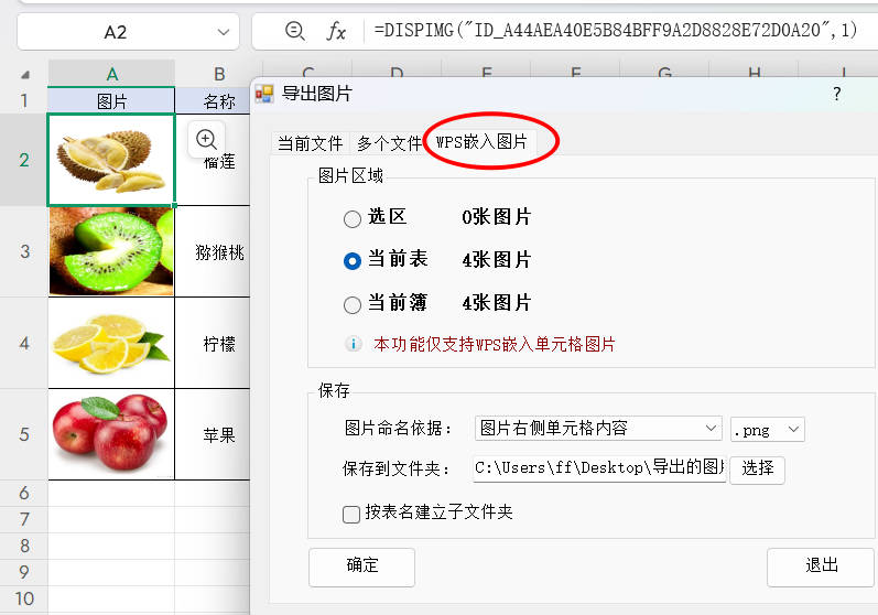1.选择功能第三个选项卡 可将WPS嵌入到单元格内的图片导出,图片区域选择当前表,图片按图片右侧单元格内容命名,格式选择.png,保存到默认路径文件夹,然后点击确定按钮