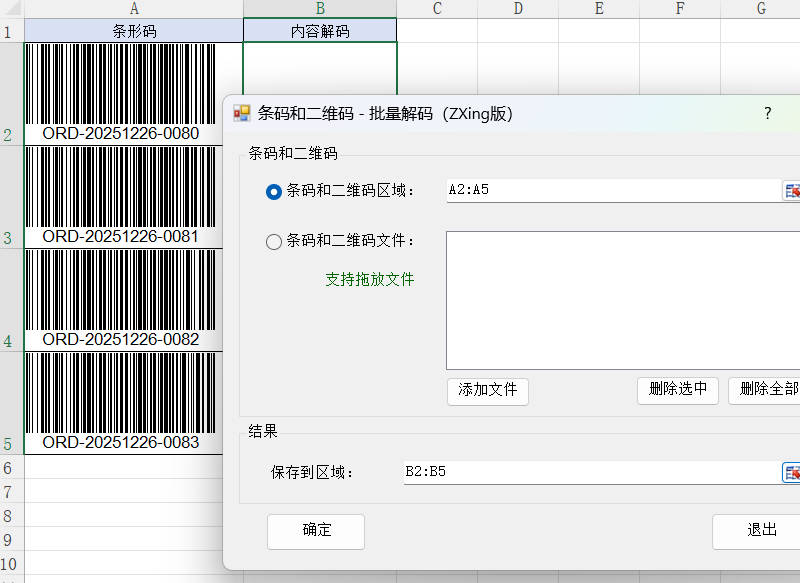 批量解码ZXing功能,可快速识别表格内 / 文件夹中ZXing二维码/条形码图片,快速提取二维码文本内容并对应输出到指定单元格,无需逐个扫码,大幅提升批量数据处理效率。