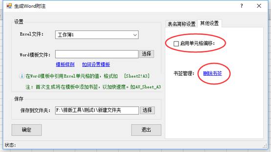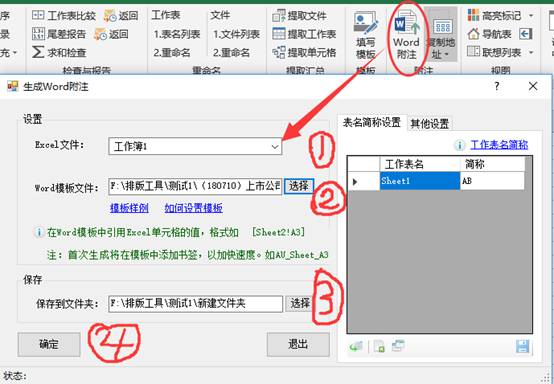 5. 在弹出的窗口中,依次选择打开的工作簿中哪个是excel附注表,选择word模板文件,选择生成结果的保存文件夹,点击确定便开始第一次生成标签,生成标签后word模板中的单元格地址就变成了word标签(看着仍然是原来复制的excel单元格地址,是因为标签不可见)。然后,程序会不间断的继续生成数据到一个自动新建的word文件中。保存在上一步设置的保存文件路径中。在这一步中原word附注模板用户需要复制出来发给同事,作为配置好标签的附注模板,下次便可直接选择这个模板快速生成。